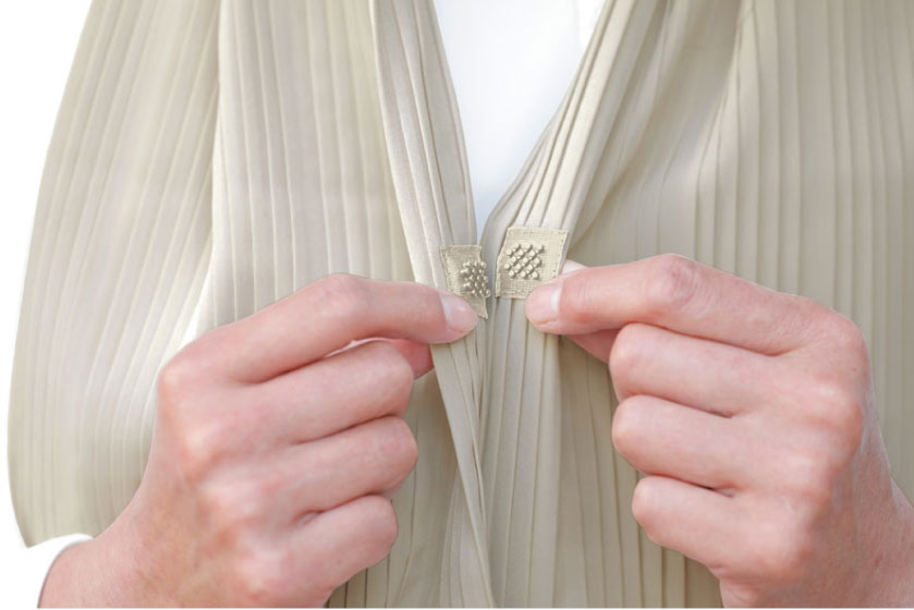 胸元には、軽い力で留められるブロック状のスナップボタンを使用しています。